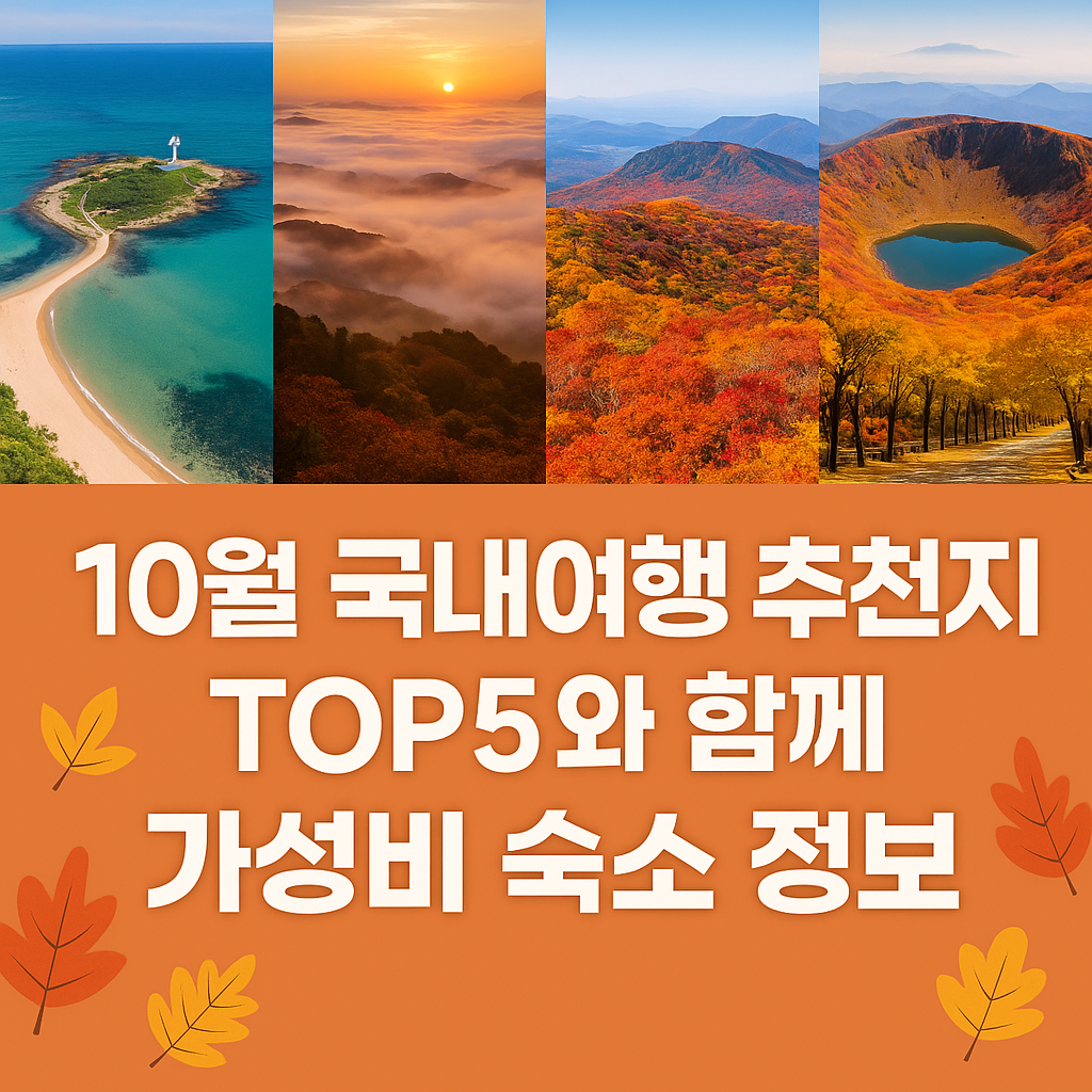추석 연휴가 지나고 나면, 본격적인 가을 여행 시즌이 시작됩니다. 선선한 바람, 울긋불긋 물드는 단풍, 그리고 비교적 저렴한 여행비용까지! 오늘은 "10월 국내여행 추천지 TOP5"와 함께 가성비 숙소 정보까지 정리해드립니다.